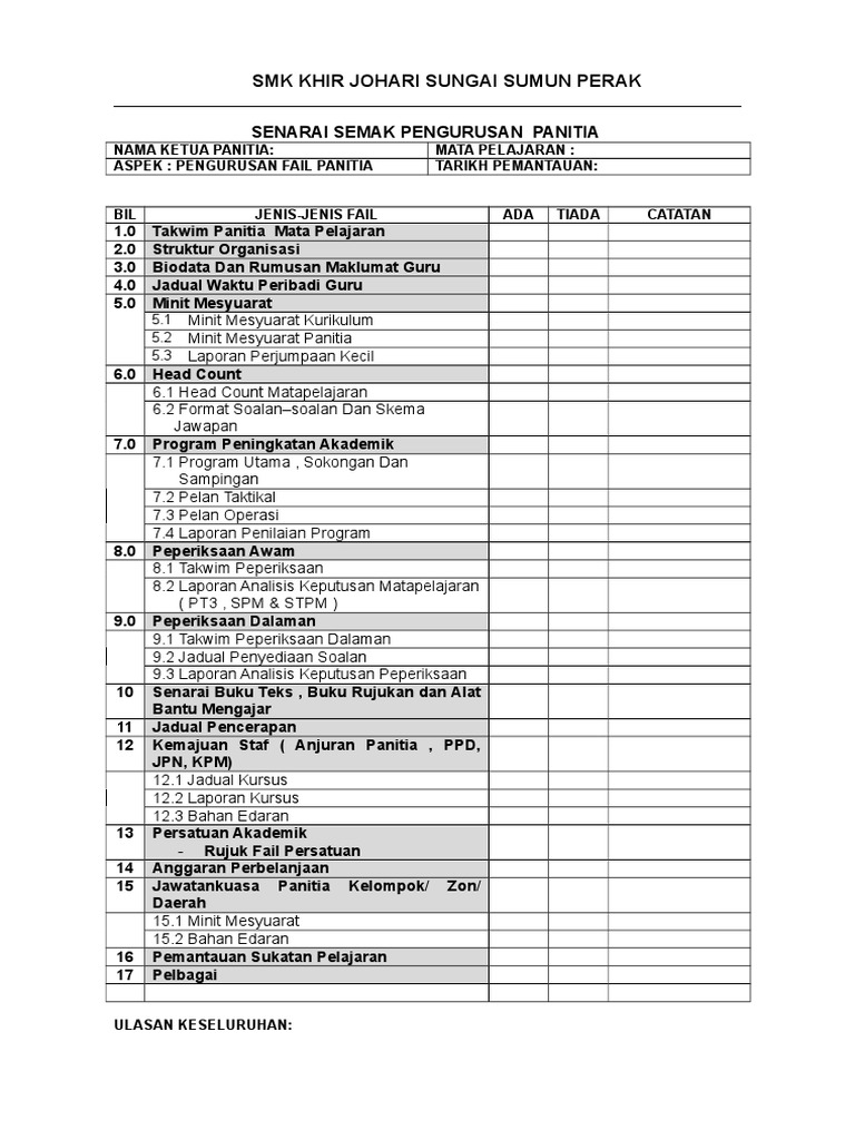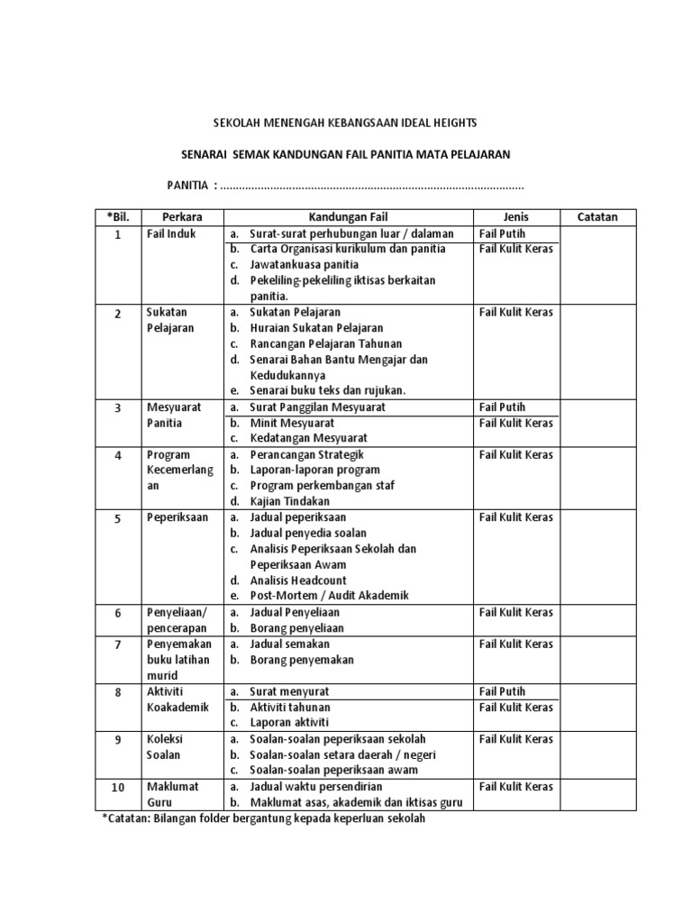 Senarai Semak Fail Panitia Mata Pelajaran Pdf