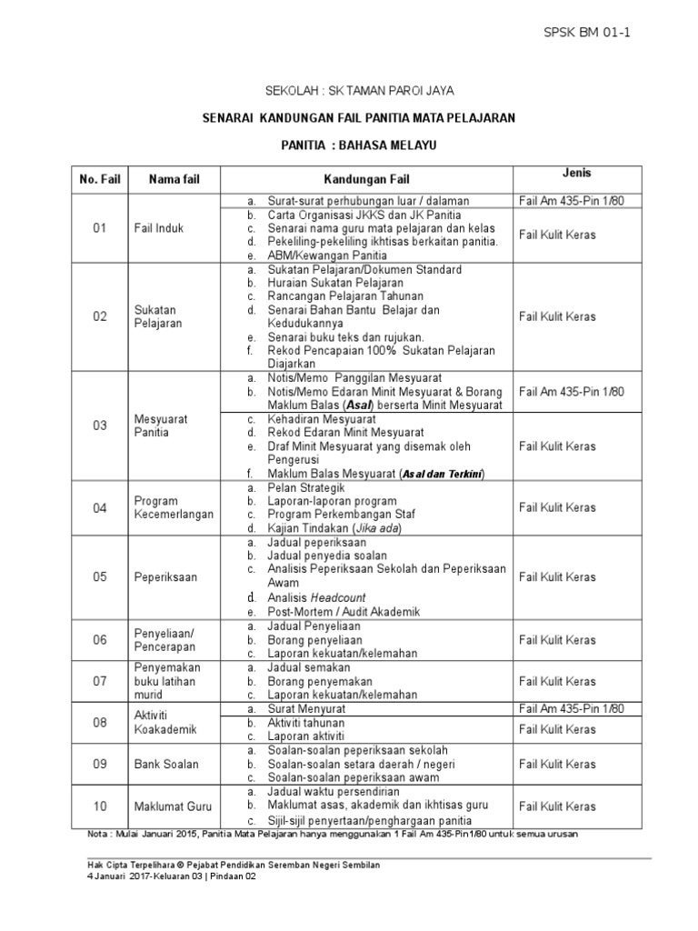 Selain daripada dokumen SPSK tersebut ketua panitia juga. PK01-1 Senarai Kandungan Fail Panitia Mata Pelajaran. Antara bahagian yang perlu ada dalam fail panitia mata pelajaran adalah.